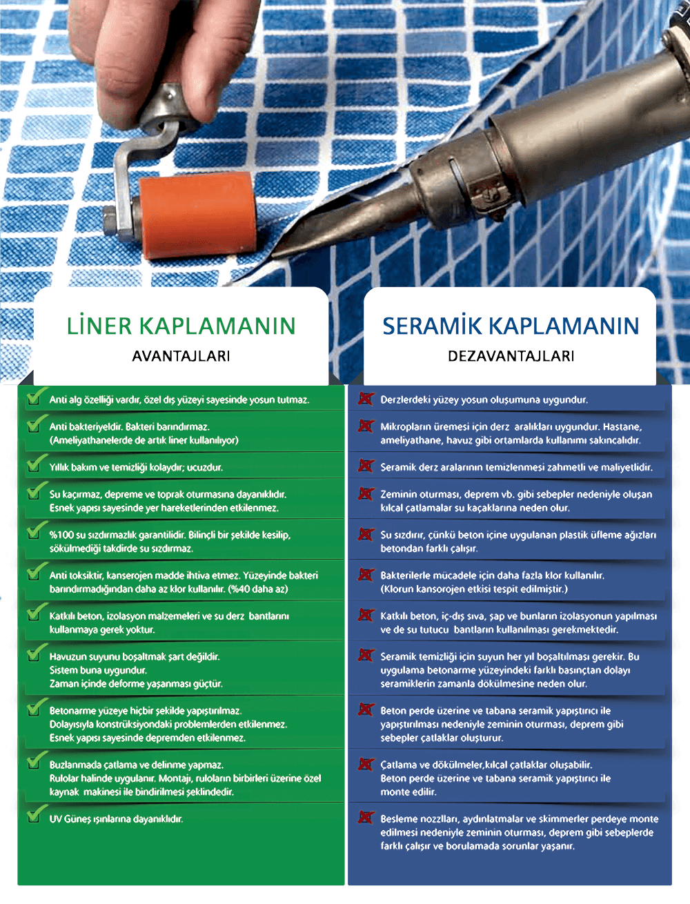 4. Havuz Taşıyıcı sistemi ile uygunluk: Liner, havuzun betonarme yüzeyine doğrudan tespit edilmeden uygulanır ve elastik yapıdadır. Bu nedenle yapı oturma hareketleri veya deprem etkisi ile taşıyıcı sistemde oluşabilecek hareket ve hasarlardan, alternatif havuz iç kaplamalarına göre daha az etkilenir.