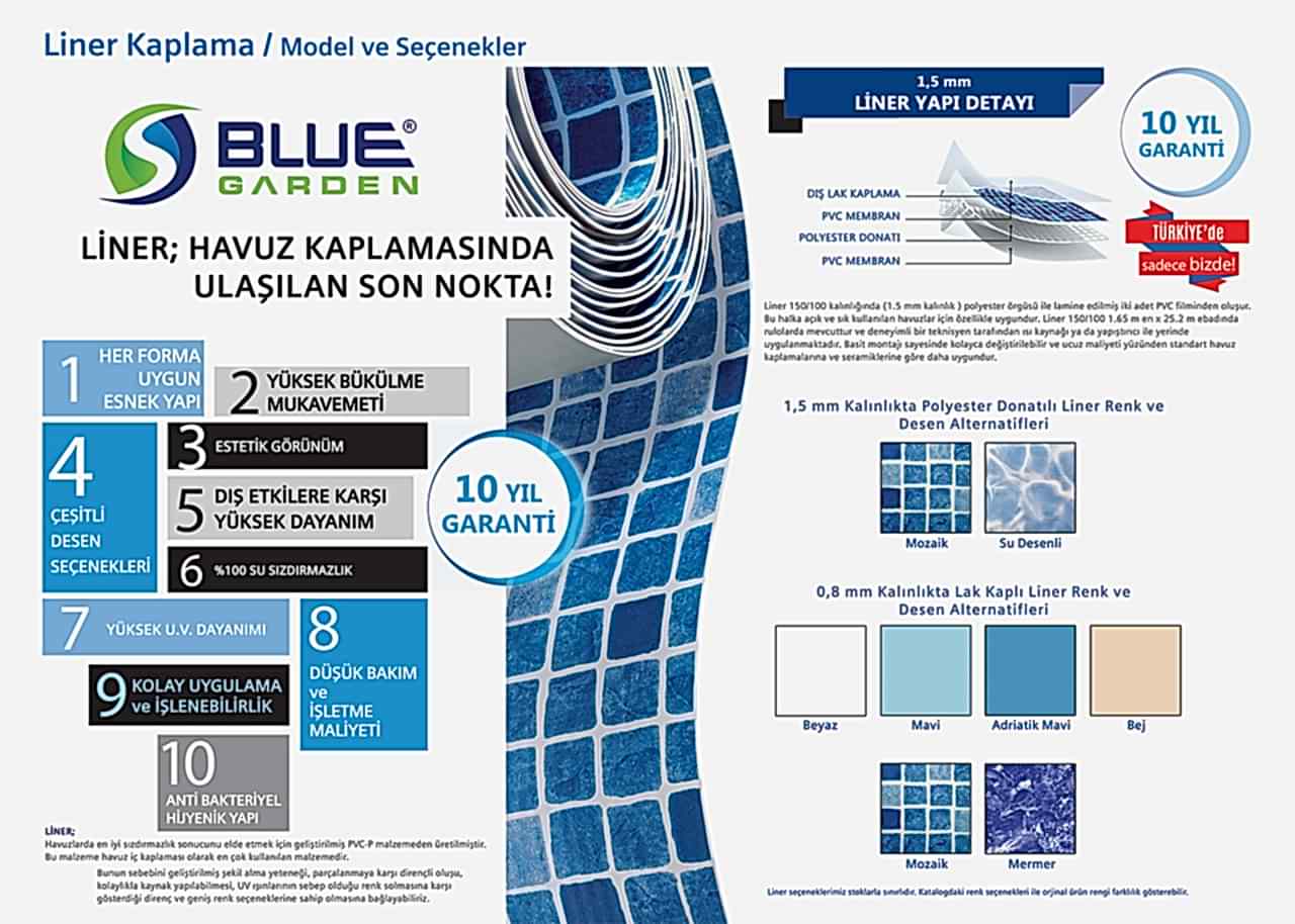 Türkiye’de liner kaplama ile havuz yapan ilk firma olan Serin Havuz liner renk ve seçenekleri ile ürün yelpazesini genişleterek hayallerinizi gerçeğe dönüştürmektedir.Havuzlarda en iyi sızdırmazlık sonucunu elde etmek için geliştirilmiş 150/100 kalınlığında PVC-P malzemeden üretilmiştir. Bu malzeme havuz iç kaplaması olarak en çok kullanılan malzemedir. Bunun sebebini geliştirilmiş şekil alma yeteneği, parçalanmaya karşı dirençli oluşu,kolaylıkla kaynak yapılabilmesi, UV ışınlarının sebep olduğu renk solmasına karşı gösterdiği direnç ve geniş renk seçeneklerine sahip olmasına bağlayabiliriz.